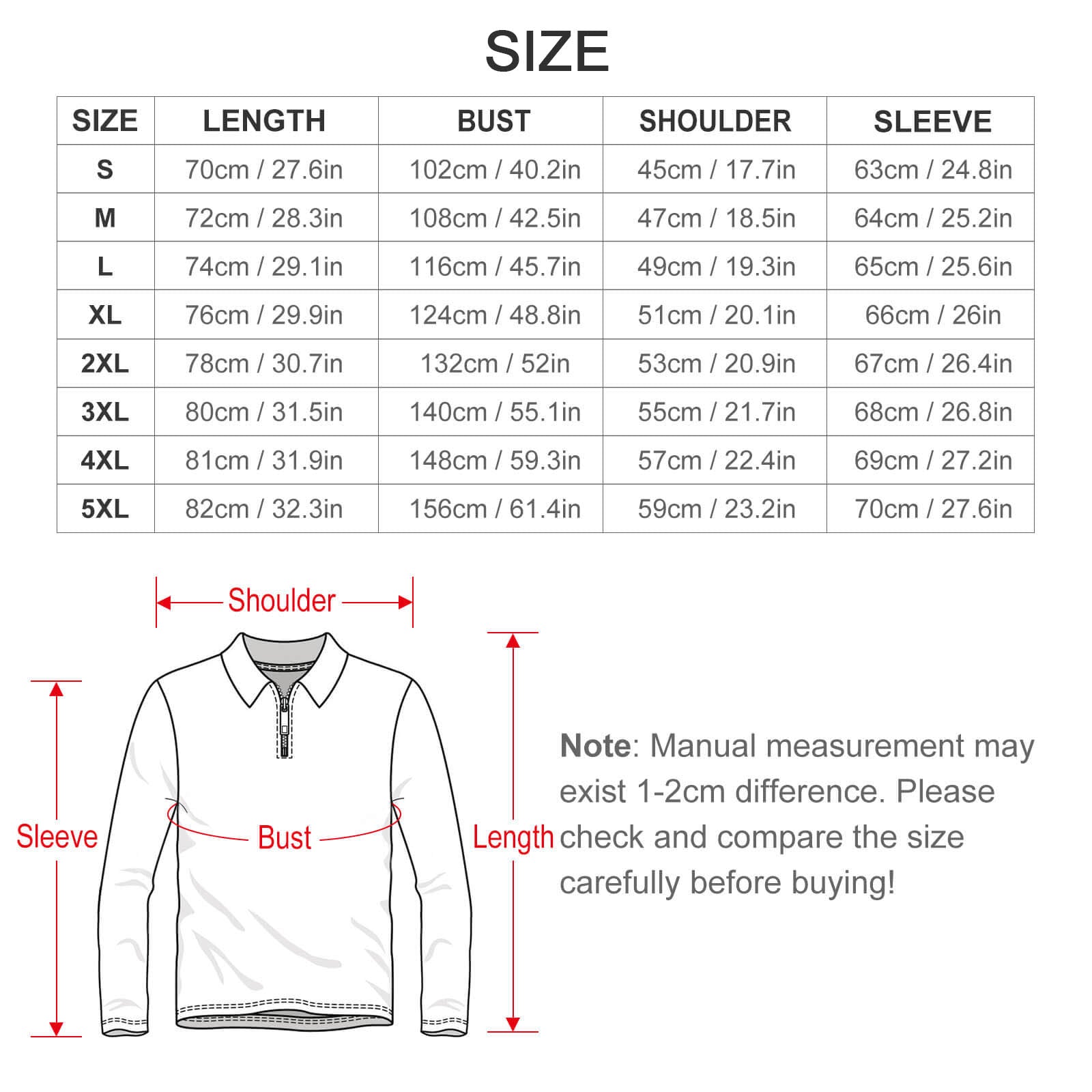 | Size | Length (cm/in) | Chest (cm/in) | 1/2 Shoulder (cm/in) | Sleeve Length (cm/in) |