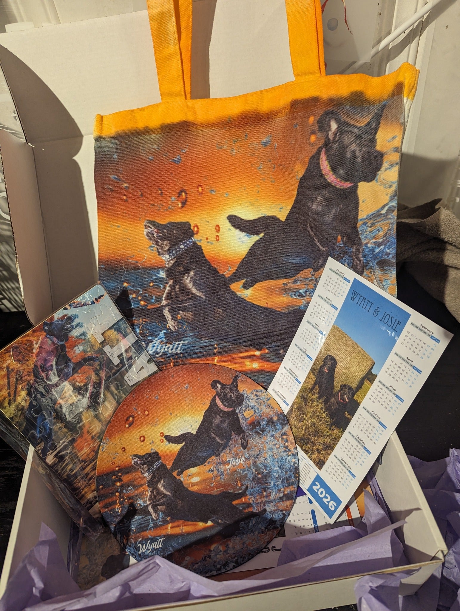 Gift boxes feature a photo of your dog on products, photo is used as uploaded.